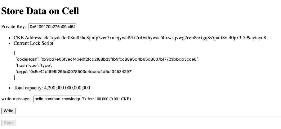 As you have learned from the first tutorial Transfer CKB, the Cell can store any type of data in the data field of Cell structure. Here we will put a text message encoding in hex string format and store it in the data field. Once your words are encoded and inscribed into the blockchain, we'll then get the hex string from the same Cell back and then decode them to the original text message. the method of encoding and decoding is totally up to your favorite, we use the TextDecoder for simplicity through the tutorial.